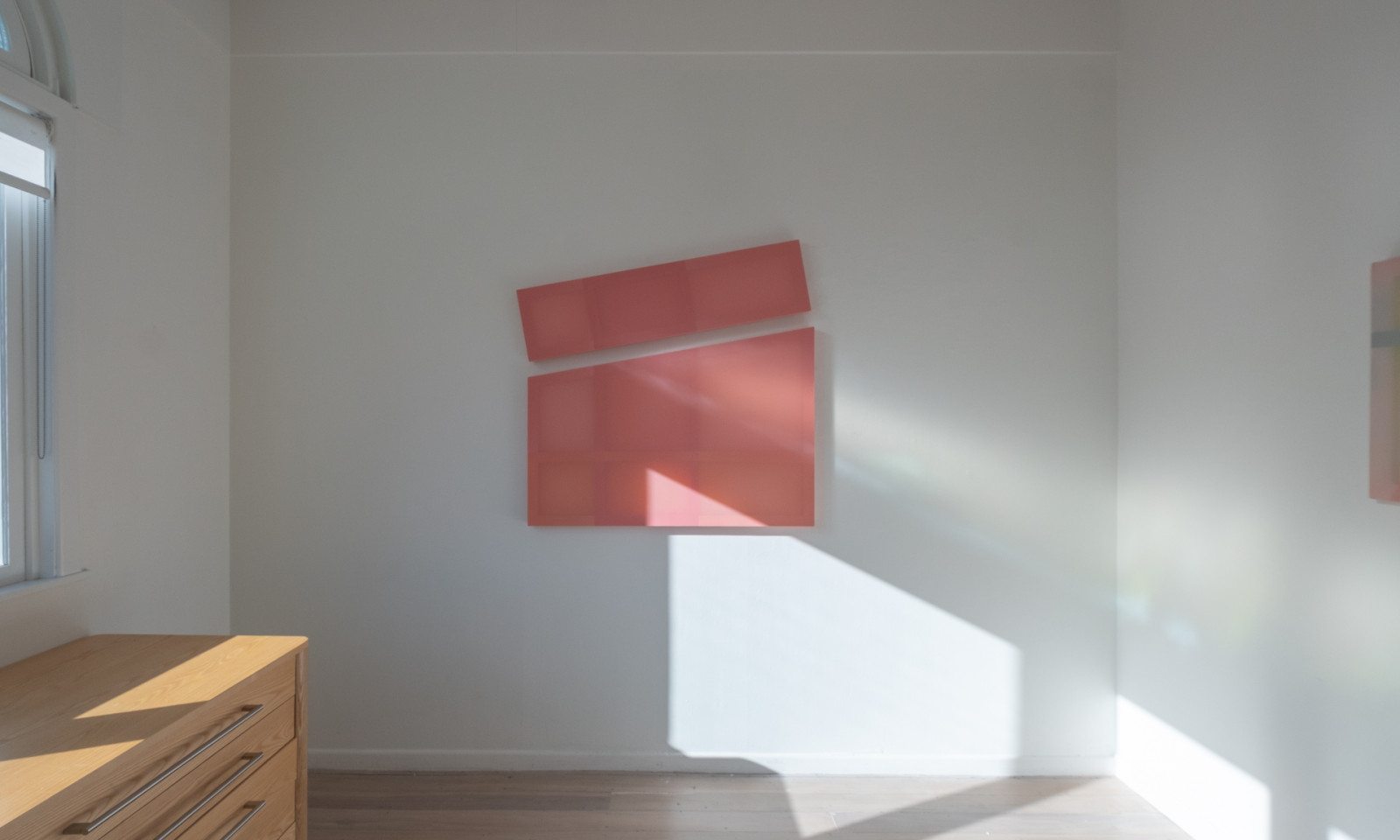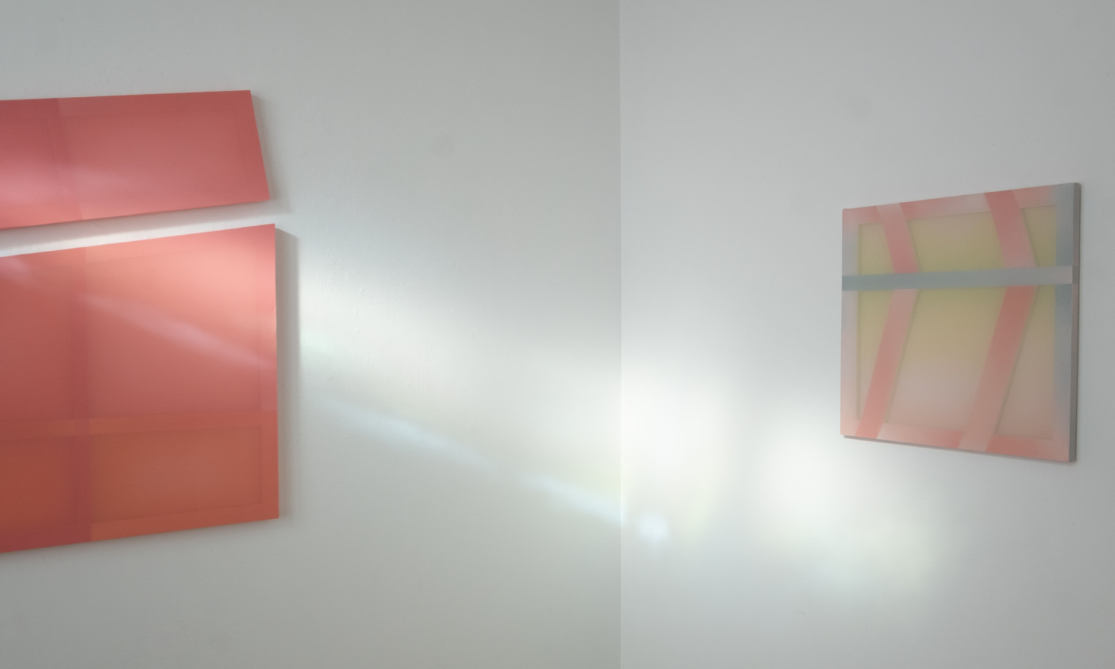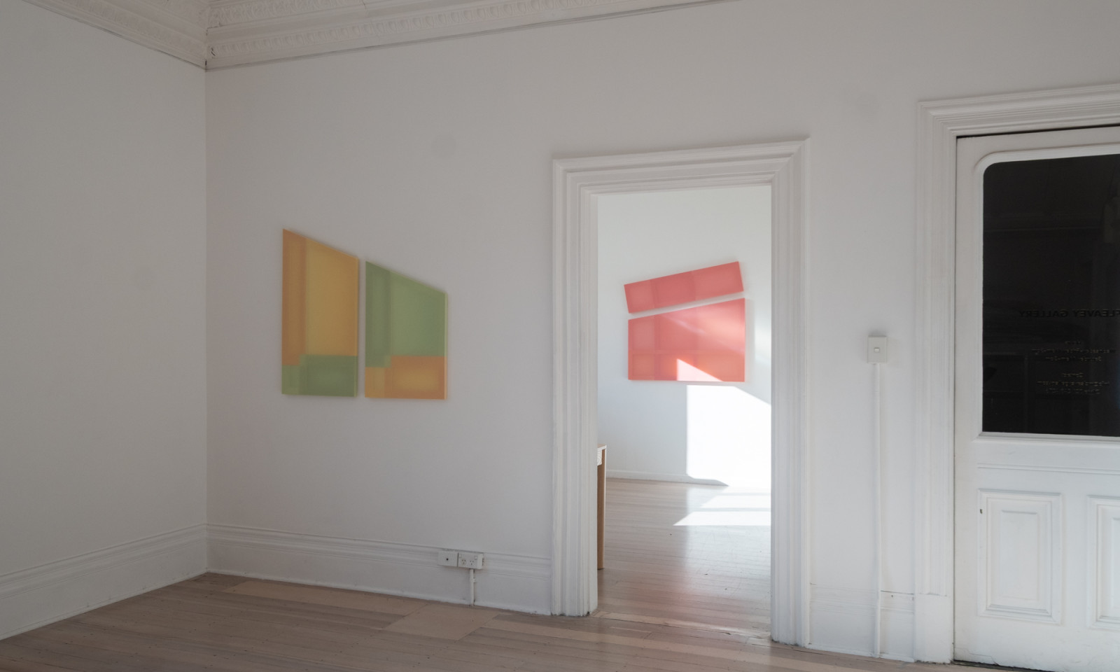 Taking cue from the reflections which cascade across walls and floors, Gilroy harnesses light play to create chromatic and spatial harmonies evocative of our environment. These artworks respond intimately to the sites they inhabit, absorbing the language of their surroundings. Light doesn’t just illuminate; it engages - its daily dance with the hues bring the works to life, casting new moods as time shifts. The works in To a Shadow’s Edge are inspired by the fleeting geometries of light and shadow within the architecture of the gallery, and the quiet impression these shadows leave behind. In these quiet transitions, the reading of colour and form is never fixed, but always evolving.