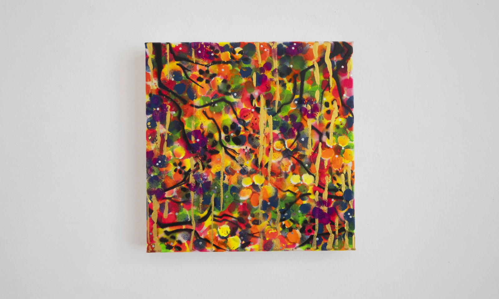 Acrylic and oil with silver pen on canvas, 300 x 300 mm